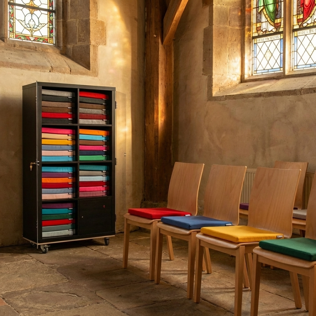 Die Laderegale von SKUDDE überzeugen nicht nur durch ihre technische Innovation, sondern auch durch ihr ansprechendes Design. Sie bieten ausreichend Stauraum für eine große Anzahl an Kissen und lassen sich dank ihrer schlanken Bauweise optimal in jeden Raum integrieren. Ob in Kirchen, Gemeinschaftsräumen oder bei Veranstaltungen – die Regale sind eine platzsparende und optisch ansprechende Lösung, die sich nahtlos in jede Umgebung einfügt.